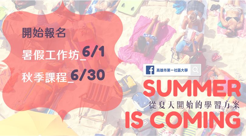 【課程】高雄市第一社區大學暑假工作坊及秋季課程即將開放報名! Posted on 2018-05-242018-05-24 高雄市第一社區大學暑假工作坊及秋季課程將於6/1及6/30開放報名 107年暑期工作坊 6/1 起開放報名【查看課程】 107年秋季班校本部課程6/30開放報名【查看課程】 107年秋季班社區分班課程6/30開放報名【查看課程】 Posted in 最新消息, 高雄市第一社區大學.