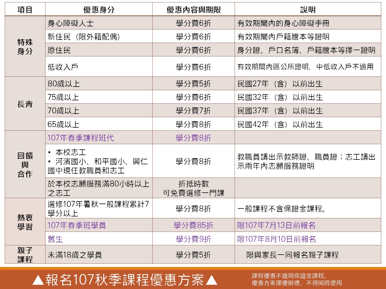 【課程】高雄市第一社區大學107年度秋季班即日起開始招生! Posted on 2018-07-032018-07-03 高雄市第一社區大學107年度秋季班即日起開始招生 107年度秋季班校本部課程:【連結】 107年度秋季班社區分班課程:【連結】 相關報名優惠辦法請見: Posted in 最新消息, 高雄市第一社區大學.