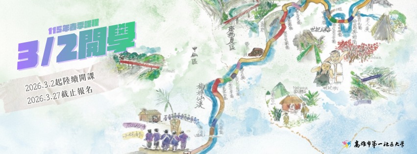 高雄市第一社區大學115年春季課程,3月2日起陸續開課 Posted on 2026-03-032026-03-03 本會承辦之 高雄市第一社區大學115年春季課程,3月2日起陸續開課 開學週免費旁聽課程 學習對身心成長助益良多,還有很多好課程,等待大家來認識!下列,千萬別錯過。 #開學週旁聽 尚未額滿課程開學第一週免費旁聽,請線上登記 https://pse.is/8qxncg。 #台灣民主歷史補課3月14日開始 線上課程免學分費,請洽第一社大報名。 #3月27日起即不受理課程報名和插班 正常開課不會通知,請至第一社大官網 khcu.com.tw <最新課程>查詢上課資訊。 Posted in 最新消息, 高雄市第一社區大學.